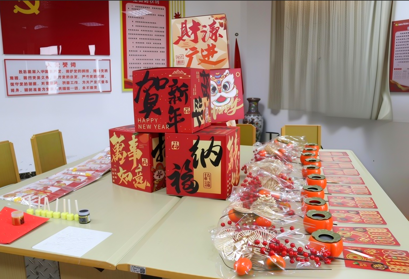 活动现场,弘益总经办与工会共同布置的场地早已洋溢着十足的年味。醒目的红色礼盒堆叠在桌案中央,“贺新年”与“万事如意”“纳福”等吉祥字样格外喜庆,搭配上舞狮图案,更添传统韵味。红红火火的拓印红纸、灯笼材料与包装精美的年花桶组件整齐码放,橙红福桶与艳红冬青相映成趣,金色装饰点缀其间,喜庆气息扑面而来。