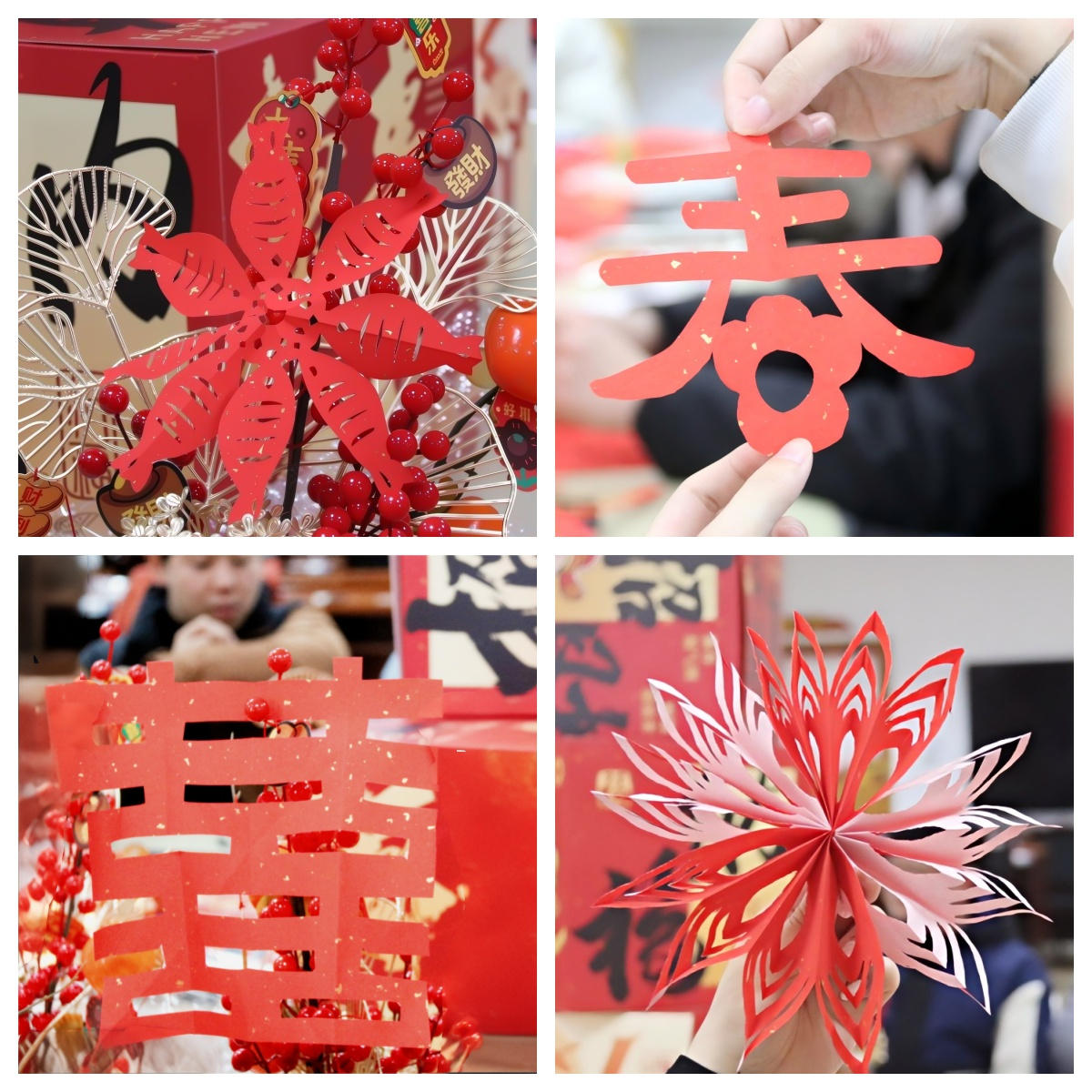大家巧用多余宣纸,对照教学视频快速学习技巧,剪刀在红宣纸上灵动游走。不一会儿,年年有余的鱼形纹样、喜庆大气的春字团花、精致灵动的银杏叶剪纸,以及红彤彤的囍字、纸艺烟花便跃然眼前。在有人遇到困难时,彼此会及时出手相助,“这里要慢慢剪,线条才流畅”,一句句贴心建议尽显弘益温度。每一件作品都饱含巧思与协作情谊,尽显迎祥纳福的美好心愿。